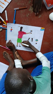 The plan to beautify Mathare with paintings by local artists and children is in process of being guided by Lily Yeh's organization Barefoot Artists based in USA. Staff, beneficiaries and locals alike have been inspired to create a Mathare that is amazing. Full of life (and bananas) the kids became hopeful to one day have a Mathare that is beautiful. No trash on the streets, a clean river, and people having colorful homes and businesses. This was reflected in the children's bright and colorful drawings. Some kids drew fruit trees growing around the slums, rainbows, flowers, a mother painting their home, and a beautiful person from the Maasai people. The staff reported after that the kids were so happy you could "tell that the children didn't even know about the shackles they were in." Until now as they begin to understand through their own dreams and drawings, the possibility of a bright and beautiful future.